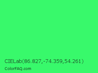 CIELab 86.827,-74.359,54.261 Color is a normal green color and the nearest color is UFO Green #3cd070. Hex code #38f96b and RGB value is rgb(56,249,107). In RGB color space, this color is composed of 22% red, 98% green, 42% blue, In CMYK color space, this color is composed of 78% cyan, 0% magenta, 57% yellow , 2% black , In HSL color space, this color has a hue angle of 136° , 94% saturation and 60% lightness.