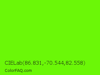 CIELab 86.831,-70.544,82.558 Color is a normal green color and the nearest color is Bright Green #66ff00. Hex code #6bf707 and RGB value is rgb(107,247,7). In RGB color space, this color is composed of 42% red, 97% green, 3% blue, In CMYK color space, this color is composed of 57% cyan, 0% magenta, 97% yellow , 3% black , In HSL color space, this color has a hue angle of 95° , 94% saturation and 50% lightness.
