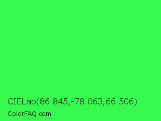 CIELab 86.845,-78.063,66.506 Color is a normal green color and the nearest color is Lime Green #32cd32. Hex code #36fa4d and RGB value is rgb(54,250,77). In RGB color space, this color is composed of 21% red, 98% green, 30% blue, In CMYK color space, this color is composed of 78% cyan, 0% magenta, 69% yellow , 2% black , In HSL color space, this color has a hue angle of 127° , 95% saturation and 60% lightness.
