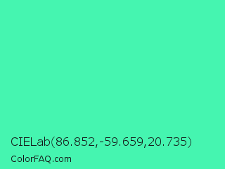 CIELab 86.852,-59.659,20.735 Color is a light green color and the nearest color is Eucalyptus #44d7a8. Hex code #45f5b0 and RGB value is rgb(69,245,176). In RGB color space, this color is composed of 27% red, 96% green, 69% blue, In CMYK color space, this color is composed of 72% cyan, 0% magenta, 28% yellow , 4% black , In HSL color space, this color has a hue angle of 156° , 90% saturation and 62% lightness.
