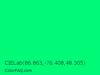 CIELab 86.863,-76.408,48.305 Color is a normal green color and the nearest color is Spring Green #00ff7f. Hex code #00fa78 and RGB value is rgb(0,250,120). In RGB color space, this color is composed of 0% red, 98% green, 47% blue, In CMYK color space, this color is composed of 100% cyan, 0% magenta, 52% yellow , 2% black , In HSL color space, this color has a hue angle of 149° , 100% saturation and 49% lightness.