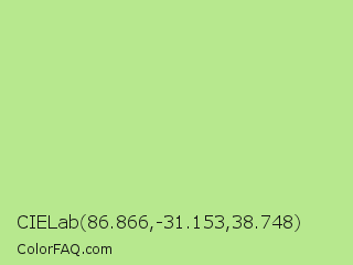 CIELab 86.866,-31.153,38.748 Color is a light green color and the nearest color is Sulu #c1f07c. Hex code #b7e88e and RGB value is rgb(183,232,142). In RGB color space, this color is composed of 72% red, 91% green, 56% blue, In CMYK color space, this color is composed of 21% cyan, 0% magenta, 39% yellow , 9% black , In HSL color space, this color has a hue angle of 93° , 66% saturation and 73% lightness.