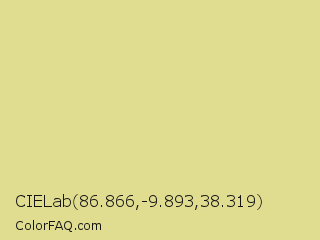 CIELab 86.866,-9.893,38.319 Color is a light yellow color and the nearest color is Wild Rice #ece090. Hex code #e1dd90 and RGB value is rgb(225,221,144). In RGB color space, this color is composed of 88% red, 87% green, 56% blue, In CMYK color space, this color is composed of 0% cyan, 2% magenta, 36% yellow , 12% black , In HSL color space, this color has a hue angle of 57° , 57% saturation and 72% lightness.