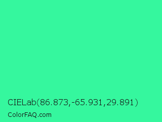 CIELab 86.873,-65.931,29.891 Color is a normal green color and the nearest color is Eucalyptus #44d7a8. Hex code #35f79e and RGB value is rgb(53,247,158). In RGB color space, this color is composed of 21% red, 97% green, 62% blue, In CMYK color space, this color is composed of 79% cyan, 0% magenta, 36% yellow , 3% black , In HSL color space, this color has a hue angle of 152° , 92% saturation and 59% lightness.
