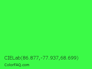 CIELab 86.877,-77.937,68.699 Color is a light green color and the nearest color is Lime Green #32cd32. Hex code #3bfa47 and RGB value is rgb(59,250,71). In RGB color space, this color is composed of 23% red, 98% green, 28% blue, In CMYK color space, this color is composed of 76% cyan, 0% magenta, 72% yellow , 2% black , In HSL color space, this color has a hue angle of 124° , 95% saturation and 61% lightness.