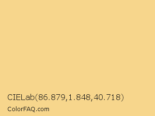 CIELab 86.879,1.848,40.718 Color is a light orange color and the nearest color is Grandis #ffd38c. Hex code #f7d68c and RGB value is rgb(247,214,140). In RGB color space, this color is composed of 97% red, 84% green, 55% blue, In CMYK color space, this color is composed of 0% cyan, 13% magenta, 43% yellow , 3% black , In HSL color space, this color has a hue angle of 41° , 87% saturation and 76% lightness.