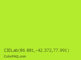 CIELab 86.881,-42.372,77.991 Color is a normal lime color and the nearest color is Green Lizard #a7f432. Hex code #b3ec2d and RGB value is rgb(179,236,45). In RGB color space, this color is composed of 70% red, 93% green, 18% blue, In CMYK color space, this color is composed of 24% cyan, 0% magenta, 81% yellow , 7% black , In HSL color space, this color has a hue angle of 78° , 83% saturation and 55% lightness.