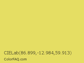 CIELab 86.899,-12.984,59.913 Color is a light yellow color and the nearest color is Booger Buster #dde26a. Hex code #e5de63 and RGB value is rgb(229,222,99). In RGB color space, this color is composed of 90% red, 87% green, 39% blue, In CMYK color space, this color is composed of 0% cyan, 3% magenta, 57% yellow , 10% black , In HSL color space, this color has a hue angle of 57° , 71% saturation and 64% lightness.