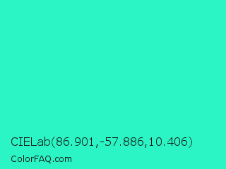 CIELab 86.901,-57.886,10.406 Color is a normal cyan color and the nearest color is Turquoise #40e0d0. Hex code #2bf5c4 and RGB value is rgb(43,245,196). In RGB color space, this color is composed of 17% red, 96% green, 77% blue, In CMYK color space, this color is composed of 82% cyan, 0% magenta, 20% yellow , 4% black , In HSL color space, this color has a hue angle of 165° , 91% saturation and 56% lightness.