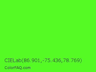 CIELab 86.901,-75.436,78.769 Color is a normal green color and the nearest color is Neon Green #39ff14. Hex code #55f923 and RGB value is rgb(85,249,35). In RGB color space, this color is composed of 33% red, 98% green, 14% blue, In CMYK color space, this color is composed of 66% cyan, 0% magenta, 86% yellow , 2% black , In HSL color space, this color has a hue angle of 106° , 95% saturation and 56% lightness.