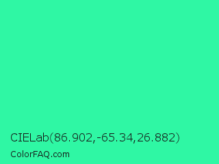 CIELab 86.902,-65.34,26.882 Color is a normal green color and the nearest color is Eucalyptus #44d7a8. Hex code #2ff7a4 and RGB value is rgb(47,247,164). In RGB color space, this color is composed of 18% red, 97% green, 64% blue, In CMYK color space, this color is composed of 81% cyan, 0% magenta, 34% yellow , 3% black , In HSL color space, this color has a hue angle of 155° , 93% saturation and 58% lightness.