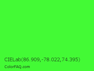 CIELab 86.909,-78.022,74.395 Color is a normal green color and the nearest color is Neon Green #39ff14. Hex code #43fa35 and RGB value is rgb(67,250,53). In RGB color space, this color is composed of 26% red, 98% green, 21% blue, In CMYK color space, this color is composed of 73% cyan, 0% magenta, 79% yellow , 2% black , In HSL color space, this color has a hue angle of 116° , 95% saturation and 59% lightness.