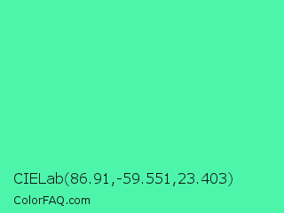 CIELab 86.91,-59.551,23.403 Color is a light green color and the nearest color is Eucalyptus #44d7a8. Hex code #4df5ab and RGB value is rgb(77,245,171). In RGB color space, this color is composed of 30% red, 96% green, 67% blue, In CMYK color space, this color is composed of 69% cyan, 0% magenta, 30% yellow , 4% black , In HSL color space, this color has a hue angle of 154° , 89% saturation and 63% lightness.