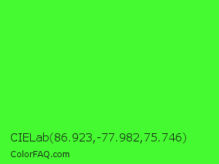 CIELab 86.923,-77.982,75.746 Color is a normal green color and the nearest color is Neon Green #39ff14. Hex code #45fa30 and RGB value is rgb(69,250,48). In RGB color space, this color is composed of 27% red, 98% green, 19% blue, In CMYK color space, this color is composed of 72% cyan, 0% magenta, 81% yellow , 2% black , In HSL color space, this color has a hue angle of 114° , 95% saturation and 58% lightness.
