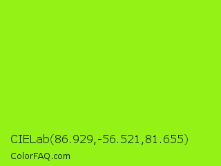 CIELab 86.929,-56.521,81.655 Color is a normal green color and the nearest color is Spring Frost #87ff2a. Hex code #94f217 and RGB value is rgb(148,242,23). In RGB color space, this color is composed of 58% red, 95% green, 9% blue, In CMYK color space, this color is composed of 39% cyan, 0% magenta, 90% yellow , 5% black , In HSL color space, this color has a hue angle of 86° , 89% saturation and 52% lightness.