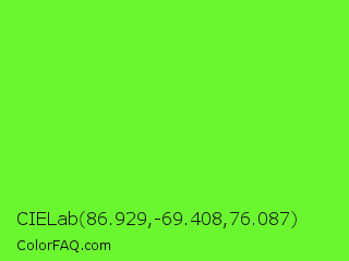 CIELab 86.929,-69.408,76.087 Color is a normal green color and the nearest color is Spring Frost #87ff2a. Hex code #6bf730 and RGB value is rgb(107,247,48). In RGB color space, this color is composed of 42% red, 97% green, 19% blue, In CMYK color space, this color is composed of 57% cyan, 0% magenta, 81% yellow , 3% black , In HSL color space, this color has a hue angle of 102° , 93% saturation and 58% lightness.