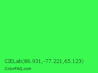 CIELab 86.931,-77.221,65.123 Color is a normal green color and the nearest color is Screamin Green #66ff66. Hex code #3afa51 and RGB value is rgb(58,250,81). In RGB color space, this color is composed of 23% red, 98% green, 32% blue, In CMYK color space, this color is composed of 77% cyan, 0% magenta, 68% yellow , 2% black , In HSL color space, this color has a hue angle of 127° , 95% saturation and 60% lightness.