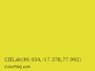 CIELab 86.934,-17.378,77.992 Color is a normal yellow color and the nearest color is Dandelion #f0e130. Hex code #e3e032 and RGB value is rgb(227,224,50). In RGB color space, this color is composed of 89% red, 88% green, 20% blue, In CMYK color space, this color is composed of 0% cyan, 1% magenta, 78% yellow , 11% black , In HSL color space, this color has a hue angle of 59° , 76% saturation and 54% lightness.