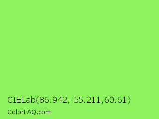 CIELab 86.942,-55.211,60.61 Color is a light green color and the nearest color is Kiwi #8ee53f. Hex code #8cf25e and RGB value is rgb(140,242,94). In RGB color space, this color is composed of 55% red, 95% green, 37% blue, In CMYK color space, this color is composed of 42% cyan, 0% magenta, 61% yellow , 5% black , In HSL color space, this color has a hue angle of 101° , 85% saturation and 66% lightness.