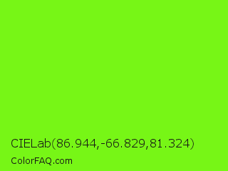 CIELab 86.944,-66.829,81.324 Color is a normal green color and the nearest color is Lawn Green #7cfc00. Hex code #77f616 and RGB value is rgb(119,246,22). In RGB color space, this color is composed of 47% red, 96% green, 9% blue, In CMYK color space, this color is composed of 52% cyan, 0% magenta, 91% yellow , 4% black , In HSL color space, this color has a hue angle of 94° , 93% saturation and 53% lightness.