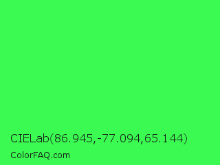 CIELab 86.945,-77.094,65.144 Color is a light green color and the nearest color is Screamin Green #66ff66. Hex code #3bfa51 and RGB value is rgb(59,250,81). In RGB color space, this color is composed of 23% red, 98% green, 32% blue, In CMYK color space, this color is composed of 76% cyan, 0% magenta, 68% yellow , 2% black , In HSL color space, this color has a hue angle of 127° , 95% saturation and 61% lightness.