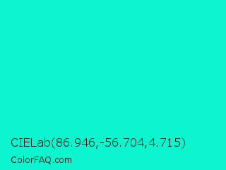 CIELab 86.946,-56.704,4.715 Color is a normal cyan color and the nearest color is Bright Turquoise #08e8de. Hex code #0df5cf and RGB value is rgb(13,245,207). In RGB color space, this color is composed of 5% red, 96% green, 81% blue, In CMYK color space, this color is composed of 95% cyan, 0% magenta, 16% yellow , 4% black , In HSL color space, this color has a hue angle of 170° , 92% saturation and 51% lightness.