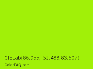 CIELab 86.955,-51.488,83.507 Color is a normal green color and the nearest color is Spring Bud #a7fc00. Hex code #a1f008 and RGB value is rgb(161,240,8). In RGB color space, this color is composed of 63% red, 94% green, 3% blue, In CMYK color space, this color is composed of 33% cyan, 0% magenta, 97% yellow , 6% black , In HSL color space, this color has a hue angle of 80° , 94% saturation and 49% lightness.