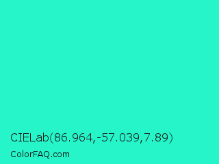 CIELab 86.964,-57.039,7.89 Color is a normal cyan color and the nearest color is Turquoise PWG #30d5c8. Hex code #26f5c9 and RGB value is rgb(38,245,201). In RGB color space, this color is composed of 15% red, 96% green, 79% blue, In CMYK color space, this color is composed of 84% cyan, 0% magenta, 18% yellow , 4% black , In HSL color space, this color has a hue angle of 167° , 91% saturation and 55% lightness.