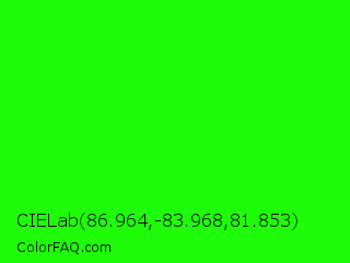 CIELab 86.964,-83.968,81.853 Color is a normal green color and the nearest color is Neon Green #39ff14. Hex code #1ffc0a and RGB value is rgb(31,252,10). In RGB color space, this color is composed of 12% red, 99% green, 4% blue, In CMYK color space, this color is composed of 88% cyan, 0% magenta, 96% yellow , 1% black , In HSL color space, this color has a hue angle of 115° , 98% saturation and 51% lightness.