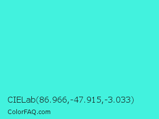 CIELab 86.966,-47.915,-3.033 Color is a normal cyan color and the nearest color is Turquoise #40e0d0. Hex code #42f2de and RGB value is rgb(66,242,222). In RGB color space, this color is composed of 26% red, 95% green, 87% blue, In CMYK color space, this color is composed of 73% cyan, 0% magenta, 8% yellow , 5% black , In HSL color space, this color has a hue angle of 173° , 87% saturation and 60% lightness.