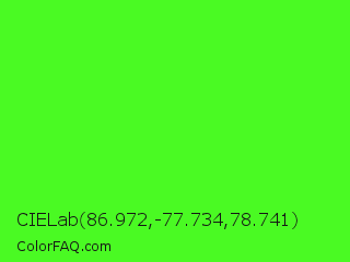 CIELab 86.972,-77.734,78.741 Color is a normal green color and the nearest color is Neon Green #39ff14. Hex code #4afa23 and RGB value is rgb(74,250,35). In RGB color space, this color is composed of 29% red, 98% green, 14% blue, In CMYK color space, this color is composed of 70% cyan, 0% magenta, 86% yellow , 2% black , In HSL color space, this color has a hue angle of 109° , 96% saturation and 56% lightness.
