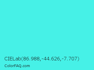 CIELab 86.988,-44.626,-7.707 Color is a light cyan color and the nearest color is Turquoise #40e0d0. Hex code #46f1e7 and RGB value is rgb(70,241,231). In RGB color space, this color is composed of 27% red, 95% green, 91% blue, In CMYK color space, this color is composed of 71% cyan, 0% magenta, 4% yellow , 5% black , In HSL color space, this color has a hue angle of 176° , 86% saturation and 61% lightness.