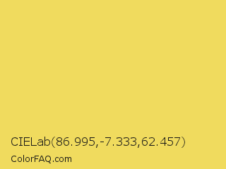 CIELab 86.995,-7.333,62.457 Color is a light yellow color and the nearest color is Energy Yellow #f8dd5c. Hex code #f0db5e and RGB value is rgb(240,219,94). In RGB color space, this color is composed of 94% red, 86% green, 37% blue, In CMYK color space, this color is composed of 0% cyan, 9% magenta, 61% yellow , 6% black , In HSL color space, this color has a hue angle of 51° , 83% saturation and 65% lightness.