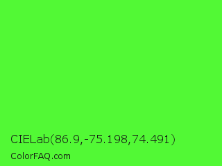 CIELab 86.9,-75.198,74.491 Color is a normal green color and the nearest color is Neon Green #39ff14. Hex code #52f935 and RGB value is rgb(82,249,53). In RGB color space, this color is composed of 32% red, 98% green, 21% blue, In CMYK color space, this color is composed of 67% cyan, 0% magenta, 79% yellow , 2% black , In HSL color space, this color has a hue angle of 111° , 94% saturation and 59% lightness.