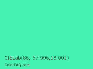 CIELab 86,-57.996,18.001 Color is a light green color and the nearest color is Eucalyptus #44d7a8. Hex code #44f2b3 and RGB value is rgb(68,242,179). In RGB color space, this color is composed of 27% red, 95% green, 70% blue, In CMYK color space, this color is composed of 72% cyan, 0% magenta, 26% yellow , 5% black , In HSL color space, this color has a hue angle of 158° , 87% saturation and 61% lightness.