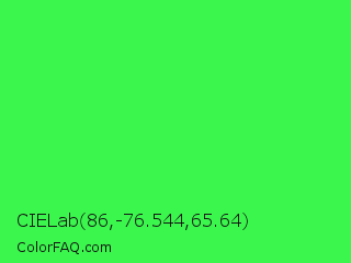 CIELab 86,-76.544,65.64 Color is a normal green color and the nearest color is Screamin Green #66ff66. Hex code #3bf74d and RGB value is rgb(59,247,77). In RGB color space, this color is composed of 23% red, 97% green, 30% blue, In CMYK color space, this color is composed of 76% cyan, 0% magenta, 69% yellow , 3% black , In HSL color space, this color has a hue angle of 126° , 92% saturation and 60% lightness.