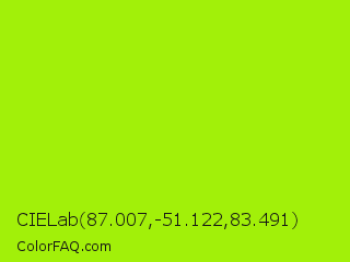 CIELab 87.007,-51.122,83.491 Color is a normal green color and the nearest color is Spring Bud #a7fc00. Hex code #a2f009 and RGB value is rgb(162,240,9). In RGB color space, this color is composed of 64% red, 94% green, 4% blue, In CMYK color space, this color is composed of 33% cyan, 0% magenta, 96% yellow , 6% black , In HSL color space, this color has a hue angle of 80° , 93% saturation and 49% lightness.