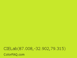 CIELab 87.008,-32.902,79.315 Color is a normal yellow color and the nearest color is Pear #d1e231. Hex code #c7e82a and RGB value is rgb(199,232,42). In RGB color space, this color is composed of 78% red, 91% green, 16% blue, In CMYK color space, this color is composed of 14% cyan, 0% magenta, 82% yellow , 9% black , In HSL color space, this color has a hue angle of 70° , 81% saturation and 54% lightness.