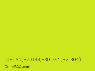 CIELab 87.033,-30.791,82.304 Color is a normal yellow color and the nearest color is Las Palmas #c6e610. Hex code #cce71c and RGB value is rgb(204,231,28). In RGB color space, this color is composed of 80% red, 91% green, 11% blue, In CMYK color space, this color is composed of 12% cyan, 0% magenta, 88% yellow , 9% black , In HSL color space, this color has a hue angle of 68° , 81% saturation and 51% lightness.