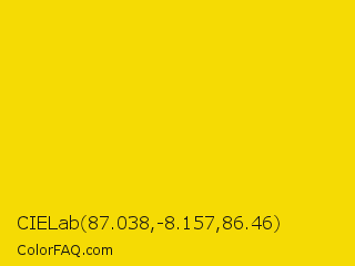 CIELab 87.038,-8.157,86.46 Color is a normal yellow color and the nearest color is Yellow Pantone #fedf00. Hex code #f5db04 and RGB value is rgb(245,219,4). In RGB color space, this color is composed of 96% red, 86% green, 2% blue, In CMYK color space, this color is composed of 0% cyan, 11% magenta, 98% yellow , 4% black , In HSL color space, this color has a hue angle of 54° , 97% saturation and 49% lightness.