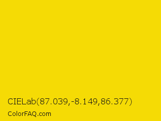 CIELab 87.039,-8.149,86.377 Color is a normal yellow color and the nearest color is Yellow Pantone #fedf00. Hex code #f5db05 and RGB value is rgb(245,219,5). In RGB color space, this color is composed of 96% red, 86% green, 2% blue, In CMYK color space, this color is composed of 0% cyan, 11% magenta, 98% yellow , 4% black , In HSL color space, this color has a hue angle of 54° , 96% saturation and 49% lightness.