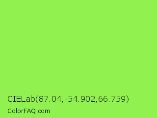 CIELab 87.04,-54.902,66.759 Color is a light green color and the nearest color is Kiwi #8ee53f. Hex code #91f24f and RGB value is rgb(145,242,79). In RGB color space, this color is composed of 57% red, 95% green, 31% blue, In CMYK color space, this color is composed of 40% cyan, 0% magenta, 67% yellow , 5% black , In HSL color space, this color has a hue angle of 96° , 86% saturation and 63% lightness.