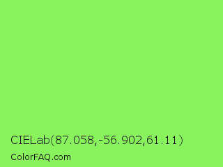 CIELab 87.058,-56.902,61.11 Color is a light green color and the nearest color is Kiwi #8ee53f. Hex code #88f35d and RGB value is rgb(136,243,93). In RGB color space, this color is composed of 53% red, 95% green, 36% blue, In CMYK color space, this color is composed of 44% cyan, 0% magenta, 62% yellow , 5% black , In HSL color space, this color has a hue angle of 103° , 86% saturation and 66% lightness.