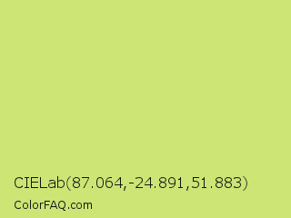 CIELab 87.064,-24.891,51.883 Color is a light lime color and the nearest color is Yellow Green #c5e17a. Hex code #cce574 and RGB value is rgb(204,229,116). In RGB color space, this color is composed of 80% red, 90% green, 45% blue, In CMYK color space, this color is composed of 11% cyan, 0% magenta, 49% yellow , 10% black , In HSL color space, this color has a hue angle of 73° , 68% saturation and 68% lightness.