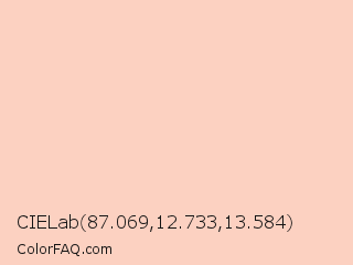 CIELab 87.069,12.733,13.584 Color is a very light orange color and the nearest color is Romantic #ffd2b7. Hex code #fcd1c1 and RGB value is rgb(252,209,193). In RGB color space, this color is composed of 99% red, 82% green, 76% blue, In CMYK color space, this color is composed of 0% cyan, 17% magenta, 23% yellow , 1% black , In HSL color space, this color has a hue angle of 16° , 91% saturation and 87% lightness.