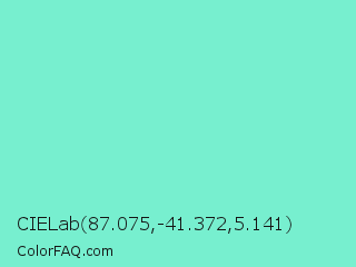 CIELab 87.075,-41.372,5.141 Color is a light cyan color and the nearest color is Aquamarine #7fffd4. Hex code #77efcf and RGB value is rgb(119,239,207). In RGB color space, this color is composed of 47% red, 94% green, 81% blue, In CMYK color space, this color is composed of 50% cyan, 0% magenta, 13% yellow , 6% black , In HSL color space, this color has a hue angle of 164° , 79% saturation and 70% lightness.