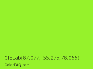 CIELab 87.077,-55.275,78.066 Color is a normal green color and the nearest color is Green Lizard #a7f432. Hex code #96f22b and RGB value is rgb(150,242,43). In RGB color space, this color is composed of 59% red, 95% green, 17% blue, In CMYK color space, this color is composed of 38% cyan, 0% magenta, 82% yellow , 5% black , In HSL color space, this color has a hue angle of 88° , 88% saturation and 56% lightness.