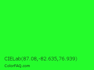 CIELab 87.08,-82.635,76.939 Color is a normal green color and the nearest color is Neon Green #39ff14. Hex code #24fc2b and RGB value is rgb(36,252,43). In RGB color space, this color is composed of 14% red, 99% green, 17% blue, In CMYK color space, this color is composed of 86% cyan, 0% magenta, 83% yellow , 1% black , In HSL color space, this color has a hue angle of 122° , 97% saturation and 56% lightness.