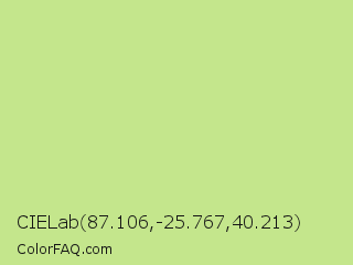 CIELab 87.106,-25.767,40.213 Color is a light green color and the nearest color is Medium Spring Bud #c9dc87. Hex code #c4e68c and RGB value is rgb(196,230,140). In RGB color space, this color is composed of 77% red, 90% green, 55% blue, In CMYK color space, this color is composed of 15% cyan, 0% magenta, 39% yellow , 10% black , In HSL color space, this color has a hue angle of 83° , 64% saturation and 73% lightness.
