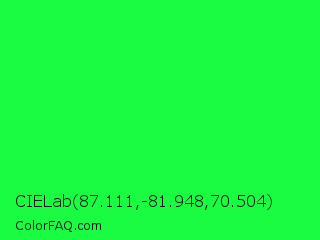 CIELab 87.111,-81.948,70.504 Color is a normal green color and the nearest color is Malachite #0bda51. Hex code #1afc42 and RGB value is rgb(26,252,66). In RGB color space, this color is composed of 10% red, 99% green, 26% blue, In CMYK color space, this color is composed of 90% cyan, 0% magenta, 74% yellow , 1% black , In HSL color space, this color has a hue angle of 131° , 97% saturation and 55% lightness.